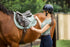 Tapis de selle de saut en coton coupe sportive . Le design minimaliste du tapis Catalina est complété par les lettres Spooks brodés et le cordon décoratif argent des deux côtés.
