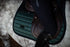 Tapis de selle au design sportif vert foncé, avec du mesh noir décoratif et un badge Equestrian Stockholm noir.